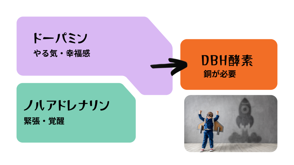 銅が多すぎる → 変換が過剰 → ドーパミン減少・ノルアドレナリン増加